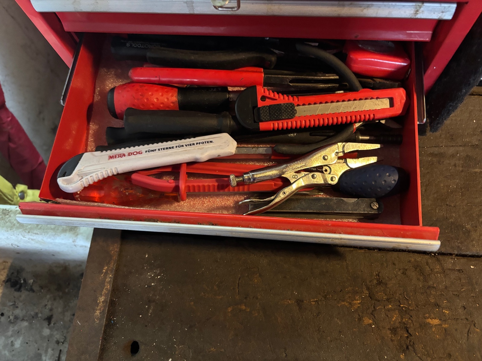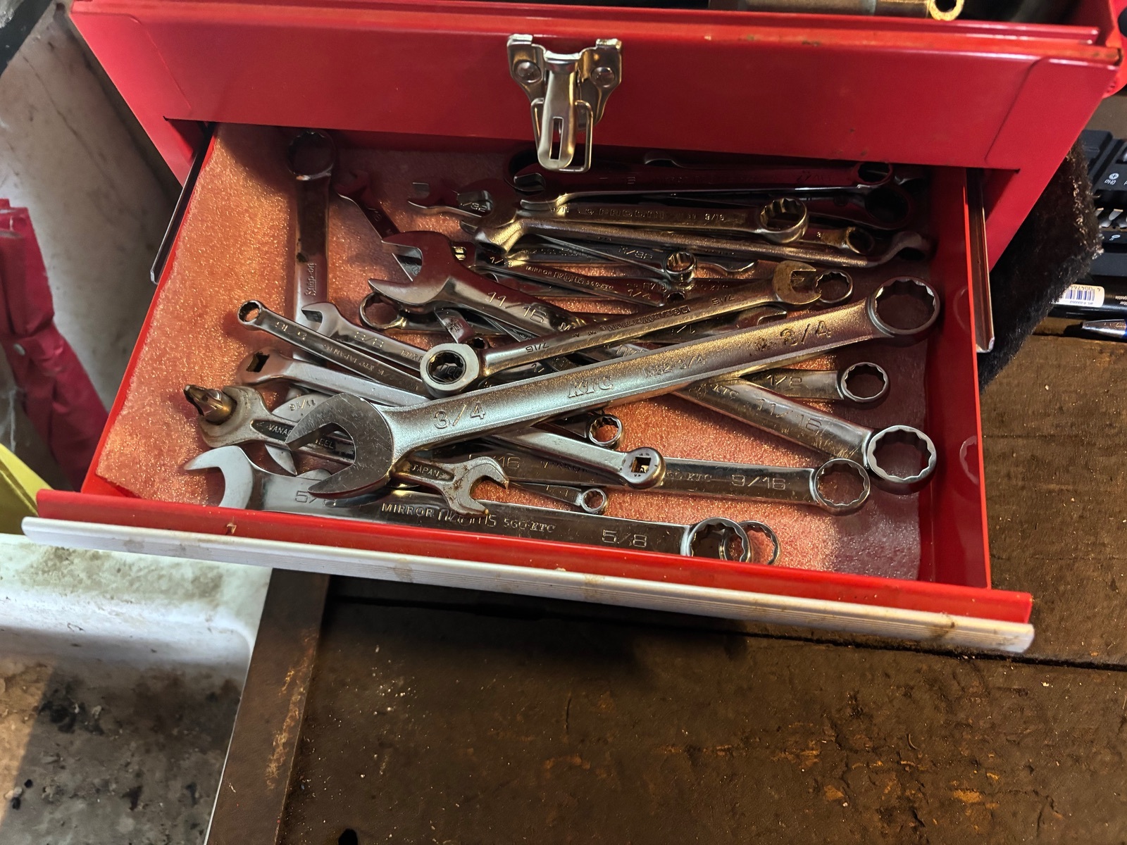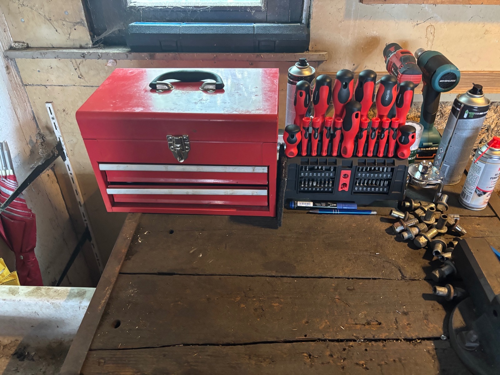 Sodele, nach Einkaufen und gutem Frühstück ging es in Garage. Erstmal 1.5 h Werkzeug sortieren (nur das absolute Notwendigste), da mir ja der Werkzeugwagen noch abgeht. Aber eine kleine Kiste hab ich ja noch. Zum neben das Auto stellen und nicht immer zur Werkbank laufen müssen, reicht es erstmal. Dabei fiel mir dann auf, dass ich noch lange Stecknüsse in AF mit 3/8“ Antrieb brauche 😀. Ist zwar fern von wie ich es gerne hätte, aber Not macht erfinderisch.