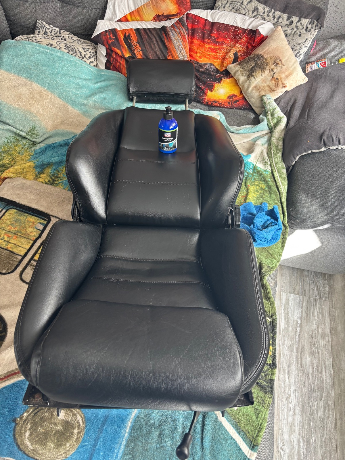 • Heute mal die Sitze und paar andere Teile aus dem Innenraum gereinigt mit Essig-Essenz-Wasser-Gemisch (weil schimmelig) und dann mit Liqui Moly Lederpflege behandelt. Jetzt sieht das alles wieder gut aus…und weil es in der Scheune zu zipfelig war, kurzum das ganze ins Wohnzimmer verlagert 😬. Den Zweithund hat das wenig interessiert 🤣🤣