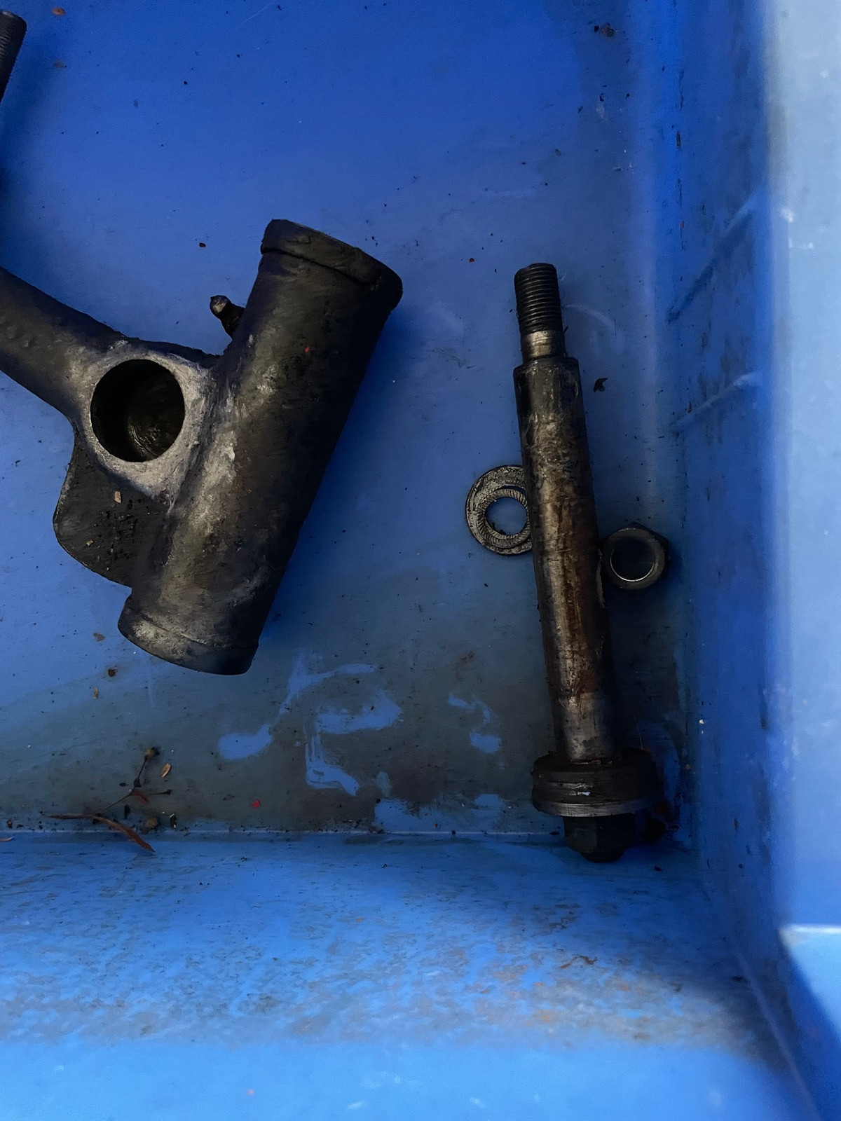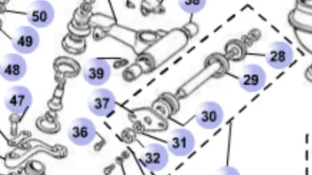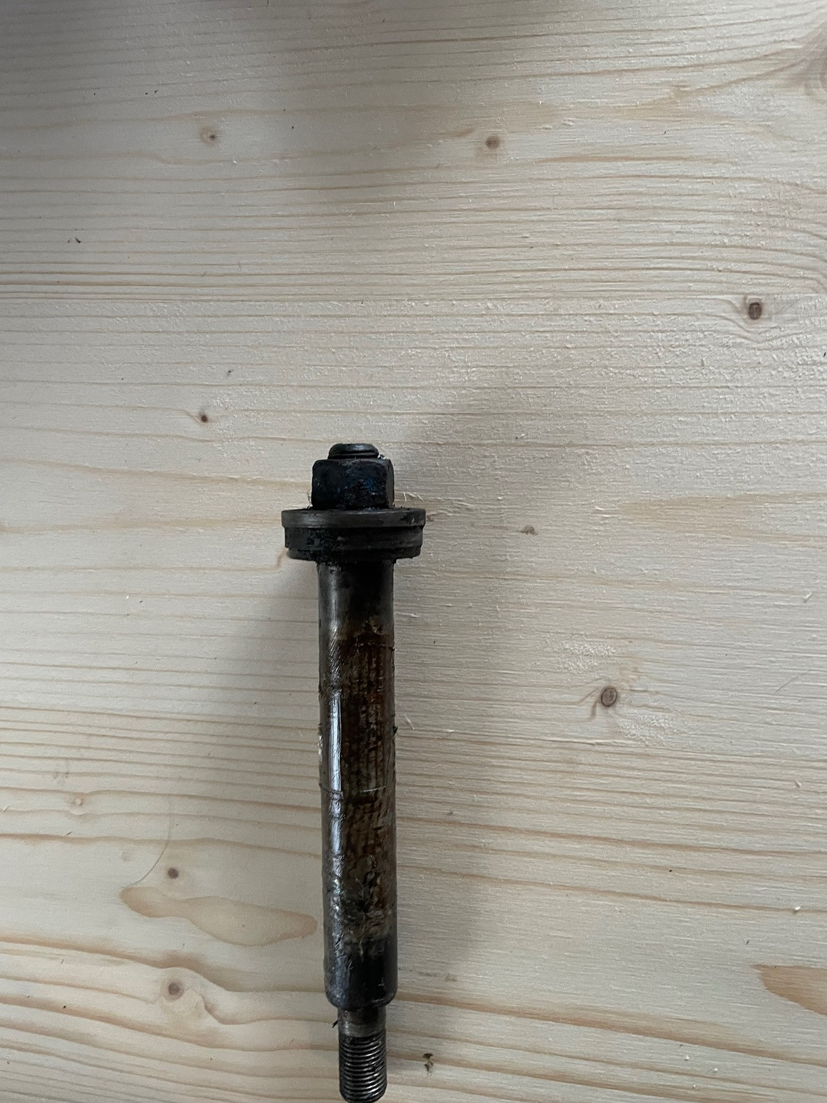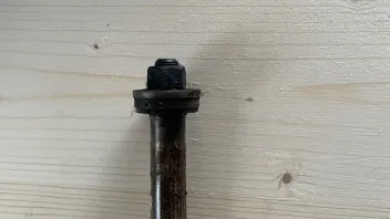 Und gleich zur nächsten Frage: Der ‚Steckbolzen‘ des oberen Querlenkers sollte doch von vorne mit einer Platte und zwei Schrauben am Rahmen gesichert sein(?) Meiner lies sich nach dem lösen der hinteren Mutter so wie auf dem Bild nach vorne rausschieben: