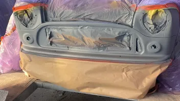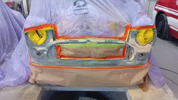 Okay, okay ich geb’s zu das Projekt wird wohl doch etwas ausarten. Wenn wir schon dabei sind und lackieren müssen, können wir auch gleich die zu großen Löchern vom originalen Grill verschließen. Nun wo die Löcher eh schon zu sind können wir auch gleich auf Schnauzbart umrüsten. Da die vorderen Verbreiterungen schon ab mussten haben wir die hinteren auch mal abgenommen um zu sehen was sich darunter verbirgt. Schaut gut aus aber wenn sie eh schonmal unten sind und wir am füllern sind… okay hmm ja gut dann werden die nun auch Wagenfarbe. Nur die Nummernschildleuchte schwarz sieht auch faul aus, also abbauen und mit Lacken. Haube ohne Leiste liegt auch noch da. Oje wollte doch nur mal schnell….