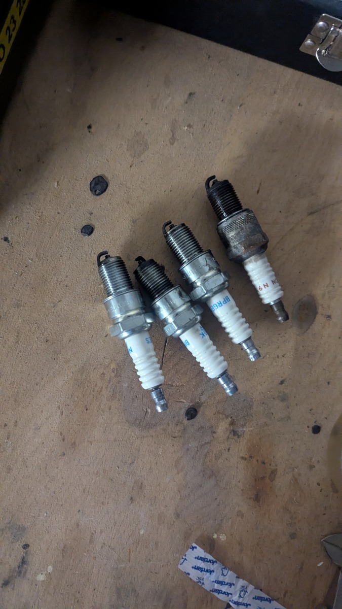 Wenn ich den Wagen anlasse, klingt es so, als wenn er starten wollte, aber es knapp nicht schafft. Ich habe jetzt mal die Zündkerzen rausgeholt. Auch dazu ein Foto. Diese sehen irgendwie unregelmäßig aus? So oder so habe ich vier neue bestellt. Eine kaputte NGK hatten wir, wie bereits berichtet, provisorisch gegen eine alte Champion getauscht.