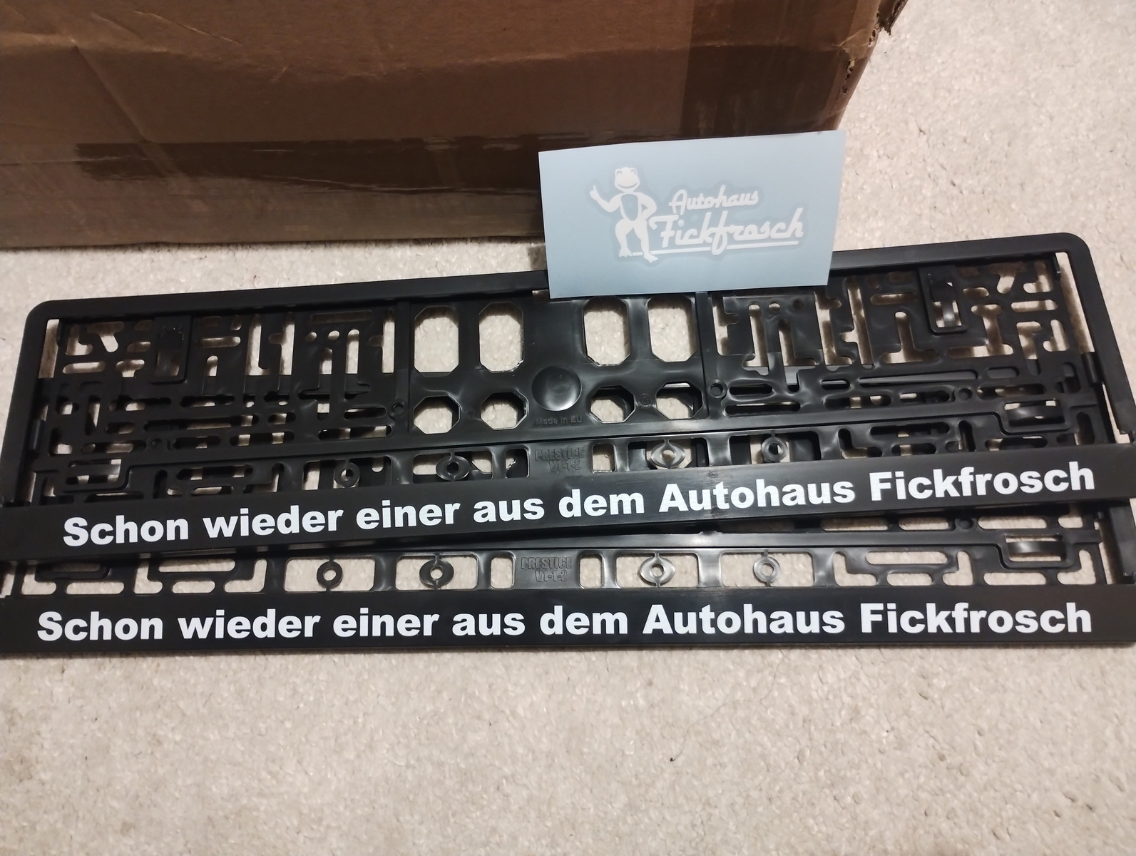 Aufkleber und Nummernschildhalter "Autohaus Fickfrosch"