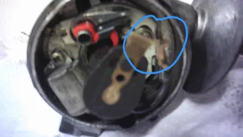 • Langsam...ist denn die Kontaktplatte, die sich über die Bewegung aus der Unterdruckdose verdreht, frei beweglich? Manchmal wird der Kontakt oder der Kondensator mit zu langen oder fehlenden Unterlegscheiben montiert und dann verklemmt die Kontaktplatte mit der Trägerplatte darunter.