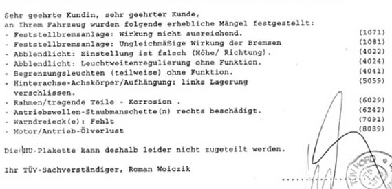 den Prüfbericht habe ich eingescannt. Schon eine erheiternde Sache, wenns nicht so ernst wäre. Hätte ich nur bloß das Warndreieck nicht vergessen. Sowas aber auch...