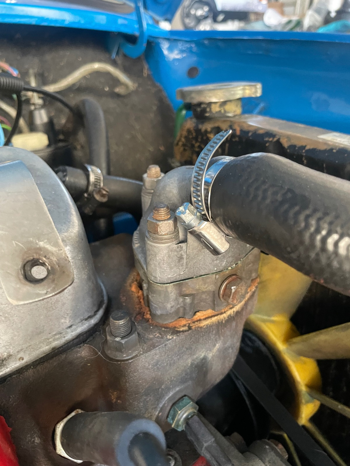 Thermostat direkt in den Kopf, Deckel drauf. Ja braucht kürzere schrauben und ein 1275 Kühlerhalteblech aber bei weitem günstiger als die Zwischenplatte die ohne Heizung keinen Sinn ergibt.