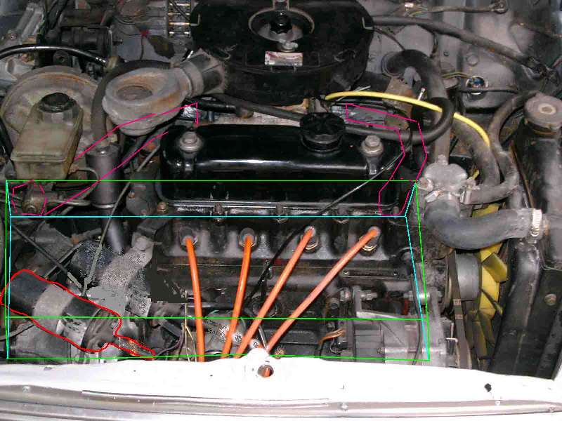 Ich habe hier mal auf die schnelle ein bisschen mit Paint gespielt, ein Motorraum von nem Turbo sieht wohl ein bisschen voller aus, die Hellgünen sind die sichtbaren, die Hellblauen die Verdeckten und die bordeaux-lila farbenen die Schläuche zum Vergaser, das rote(links unten) soll der neue Platz für die Zündspule sein.