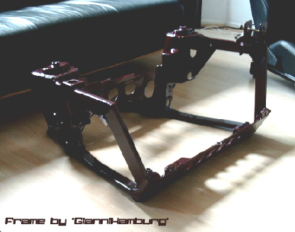 Natürlich war bei mir auch schon alles eingebaut, so ca. 3-20 mal. Rein raus - Rein Raus - passt es hier und da? Wenn man einen Rahmen noch nie gebaut hat, kann man das einfach nicht wissen. Da sieht das alles Pippi aus. Ich denke mal, genug Leute können meine Arbeit hier qualifizieren und sich entsprechende Gedanken machen und eine Meinung bilden. Ob gut oder schlecht. Das ist auch euer gutes Recht - meins aber auch. Bestimmt habe ich nicht den tollsten Rahmen, aber einen guten, neuartigen und eigenen gebaut. Einen Gianni Rahmen - Keinen Ringrahmen. Wenn ich damit auf der Bahn sterbe bin ich es Schuld - und nur ich ! Ich weiß wie ich was gebaut habe, wo es ruckelt oder zuckelt und welche Naht wie und wo und wenn überhaupt oder warum sie gemacht wurde. Ich hab den Rahmen für mich gebaut - für mein Gewissen. Das ist mir wichtig. Falls Ihr irgendwo Zweifel an meinem Konstrukt oder dem ganzen Auto habt, das ihr nur von Photos kennt und diese Situation euch eine genügende Qualifizierung unmöglich macht, bin ich natürlich auch immer gerne dazu bereit, einen Direkt-Vergleich möglich zu machen und dann mein Auto z.B. in Barcelona bei der IMM neben eure bereits fahrenden Autos zu stellen.