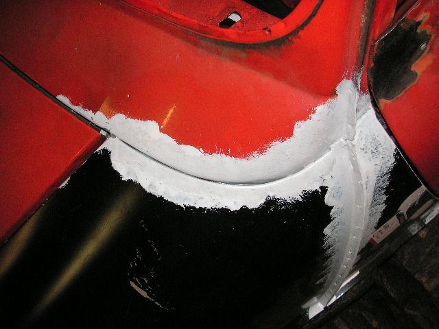 Danach mit Wasser auswaschen, direkt trocknen, mit 2K-Epoxy-Primer versiegeln und dünn mit Karosseriedichtmasse (überlackierbar) abdichten.