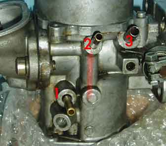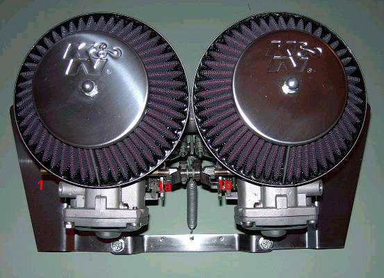 Zwischen 1a und1b habe ich einen Verbindungsschlauch gelegt. Der 1a-Anschluss scheint mir ein "Spritbypass" für den zweiten Vergaser zu sein?!