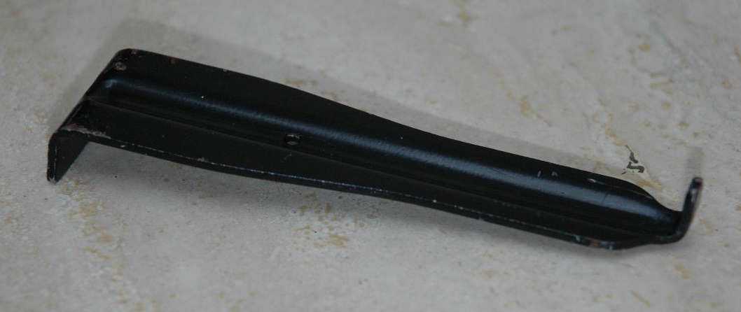 Das Blech ist ungefähr 12 Zentimeter lang, am einen Ende 3 Zentimeter und am anderen Ende 7 Millimeter breit, beide Enden sind rund einen Zentimeter abgewinkelt, und zwar entgegengesetzt, so dass es in der Seitenansicht eine Art "Z" ist, ungefähr so.