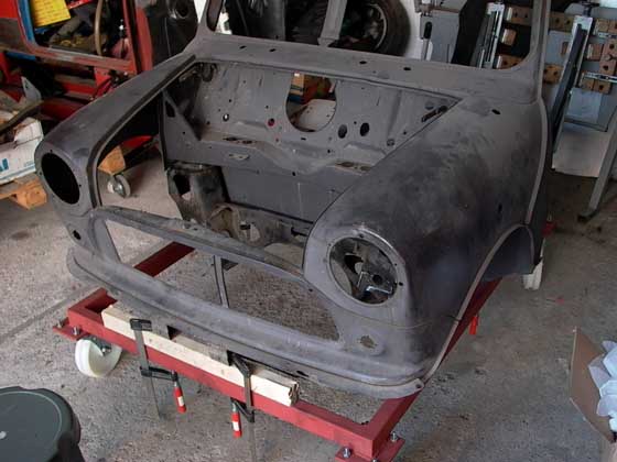 Abgesehen von diversen gebrauchten Achsrahmen kann auch ein ganzer Vorderwagen nicht schaden. Der hat wiederum den Vorteil, daß nicht ein kompletter Versuchsmini in der Garage steht und Platz wegnimmt. Ich habe ein ganzes "Neuteil" bei ebay erworben und das auf einen Rahmen mit Rollen gestellt.