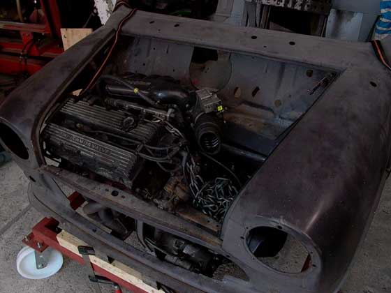 C) Jetzt hat man alles fixiert und man kann mit einem Motorkran ungefähr hunderttausenmal den Motor in das Gerippe des übergebliebenen Vorderachsrahmens rein und raus jonglieren. Neben sich hat man immer noch den Mini stehn, der zusammengebaut ist und kann eventuell hier Maße abnehmen: