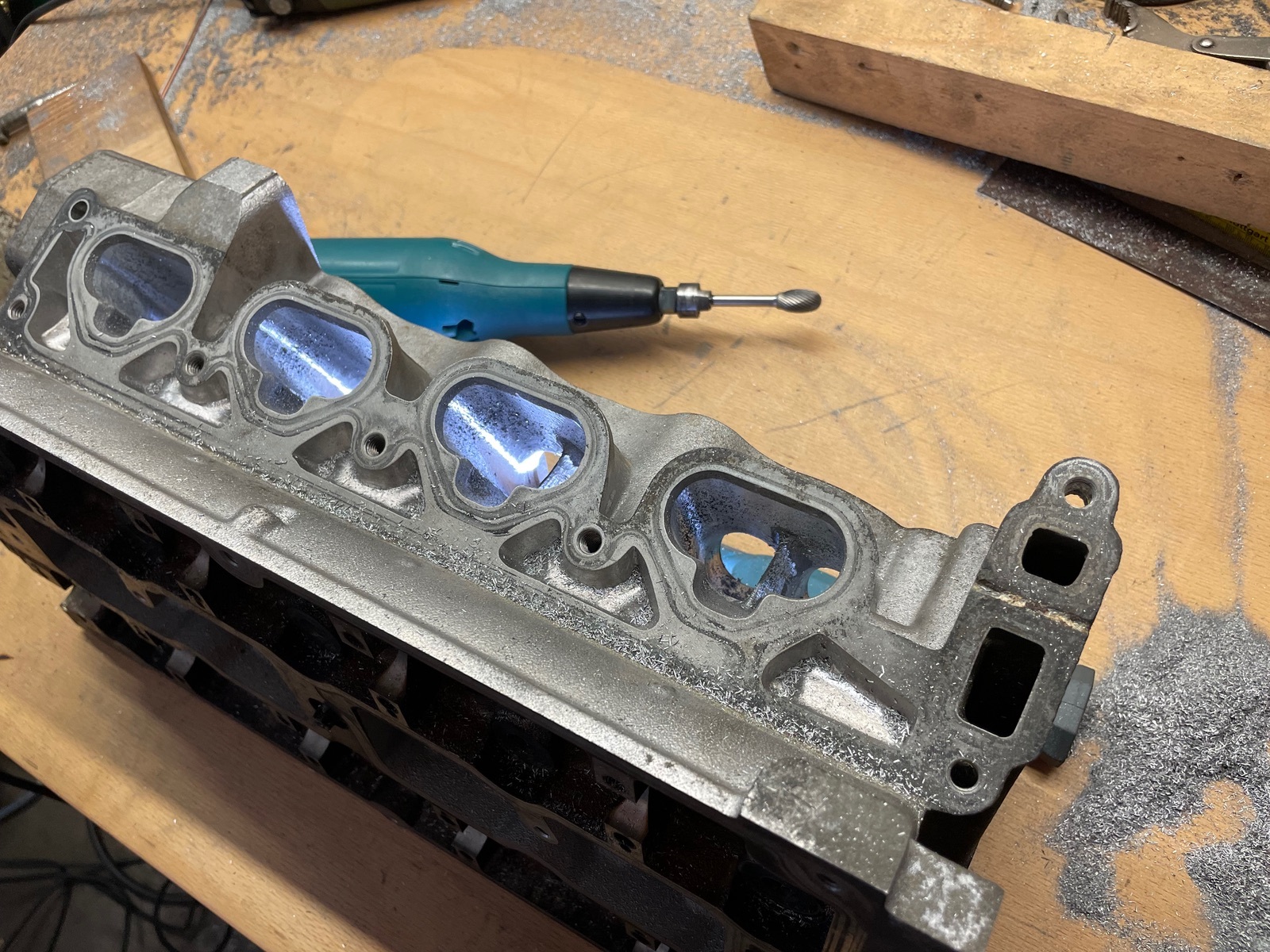 Die Bearbeitung des Zylinderkopfes wurde begonnen, aber hier ist noch einiges an Schweiß-, Fräs- und Schleifarbeiten notwendig bevor die neuen Ventilführungen eingesetzt und bearbeitet werden und die Ventilsitze geschnitten werden können.