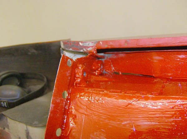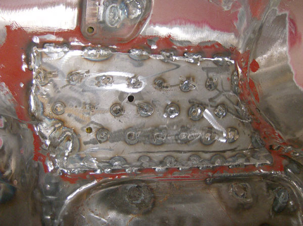 ...und noch schnell das Loch an der hinteren Rahmen-Festlegung des vorderen HiRa's geflickt. Von innen die Verstärkungen der entsprechenden Punkte aufgeschweißt und Feierabend.