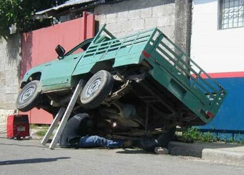 sachmal, ist der typ lebensmüde!? das sind doch ganz normale 4kanthölzer, oder sehe ich das falsch!?