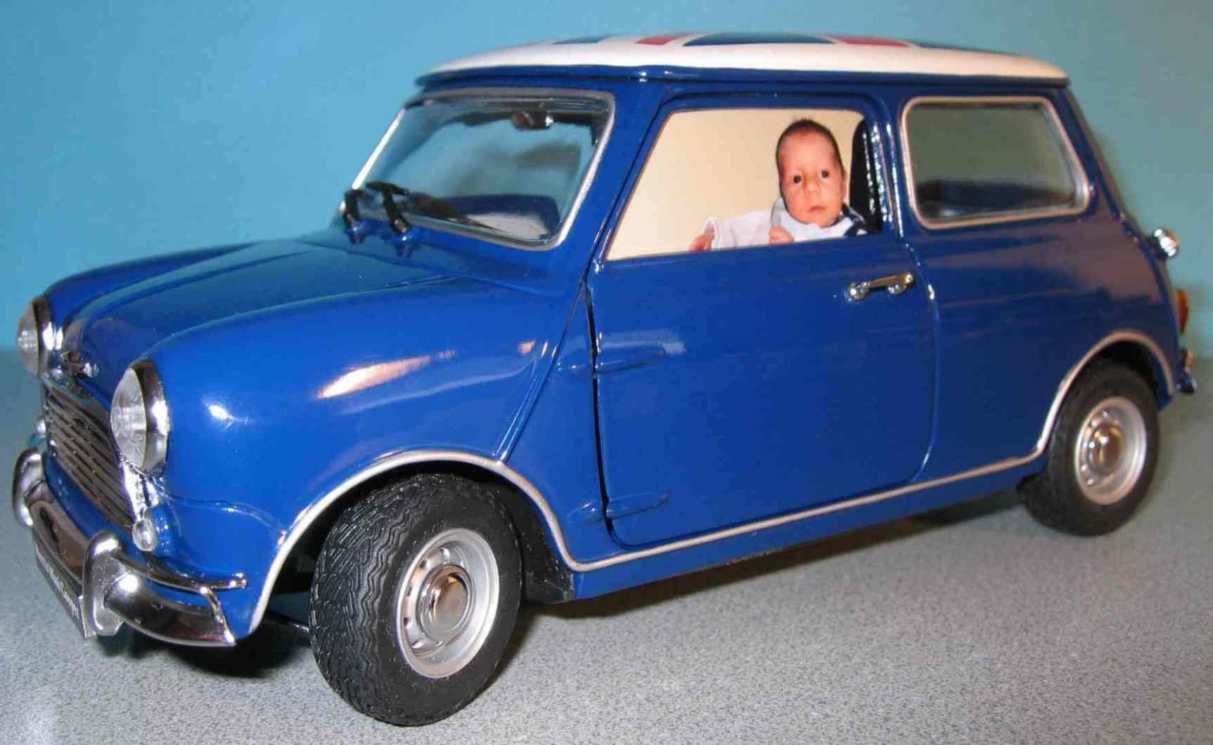 Auf dem Foto seht ihr mich mit meinem eigenen Mini. Der Papa hat ihn mir gleich am Tag nach meiner Geburt geschenkt. Er sagte etwas von "Wäre wichtig für meine Entwicklung". Keine Ahnung, was er meint!