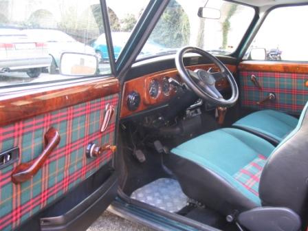 Wurzelholz, rot-grün karrierte Sitze (Schottenmuster), rote Gurte, Lederlenkrad, Riffelblech-Fußmatte, RC Blaupunkt, ...