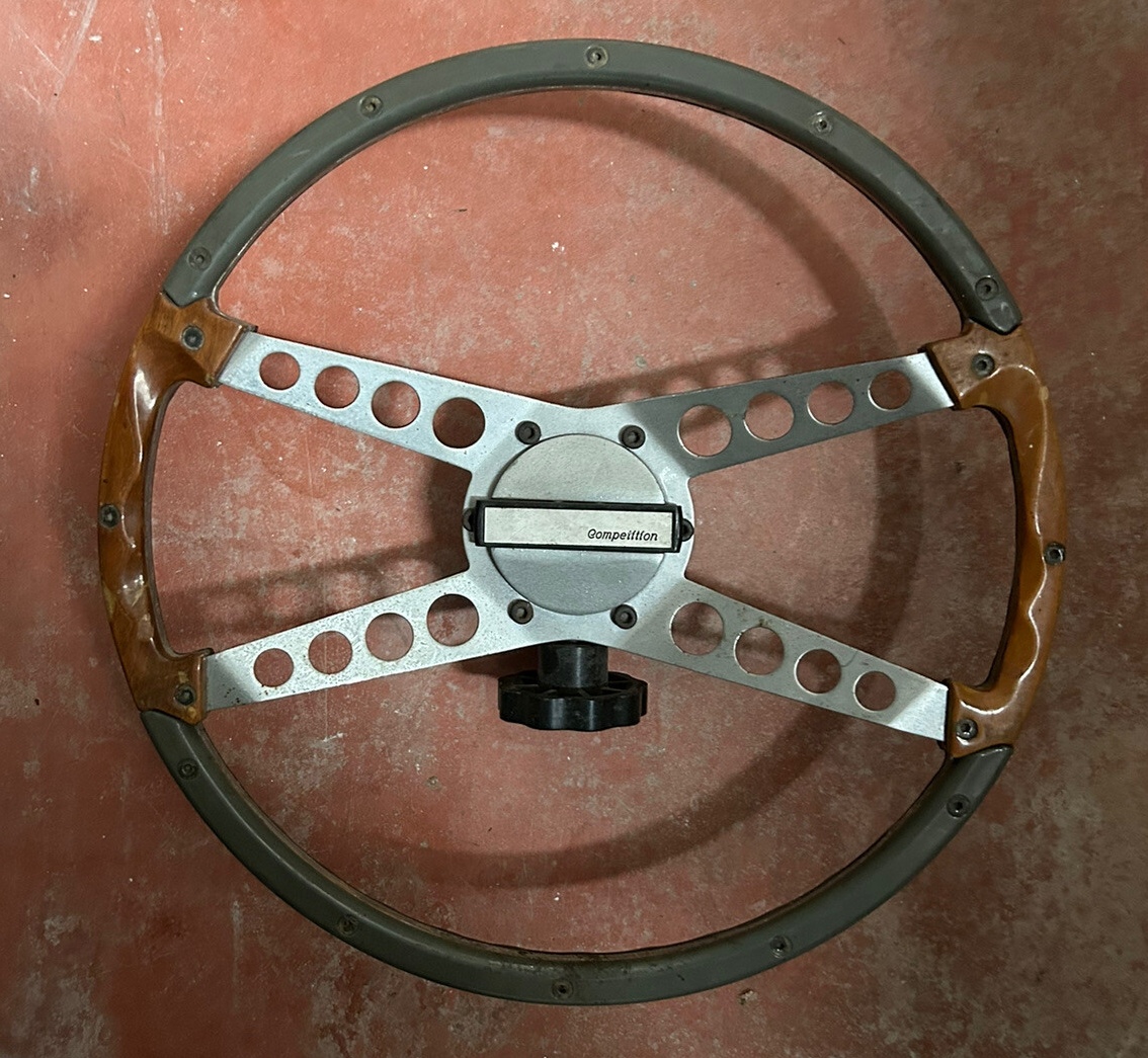 Die Geschichte dazu: Ich hatte so ein "Competition" Lenkrad schon mal vor etwa 30 Jahren besessen. Ich gab es einem befreundeten Galvaniseur zum neu Verchromen. Der hatte dann einen schweren Unfall --> Koma --> nach ewig langem Genesungsprozess Erinnerung weg und auch 90% der Teile meines Lenkrads. Nur noch der rechteckige Hupenknopf und die Rändelschraube der Längenverstellung sind mir bis heute erhalten geblieben. Ja, und natürlich die Sehsucht nach diesem Lenkrad. Und was soll ich sagen, ich habe mich kürzlich auf die lange Suche und an die Recherche gemacht und wie es der Zufall will, war nun grad eins auf Ebay.it zum Verkauf.