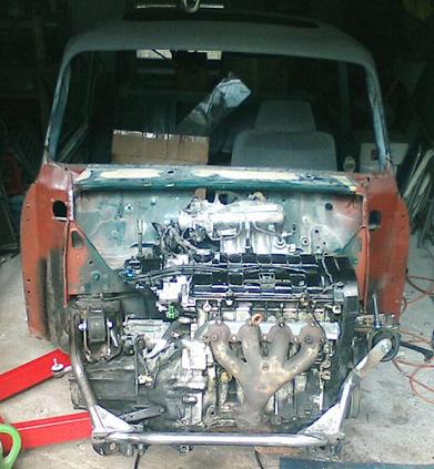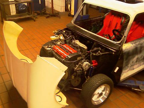 nachdem ich die technik komplett überholt habe und alle fälligen karosseriearbeiten durchgeführt hatte (der mini hatte sehr wenig rost, bj 89) habe ich mir beim mr cooper den hilfsrahmen bestellt, den er mir direkt mit den dafür angefertigten antriebswellen gebaut hat.
