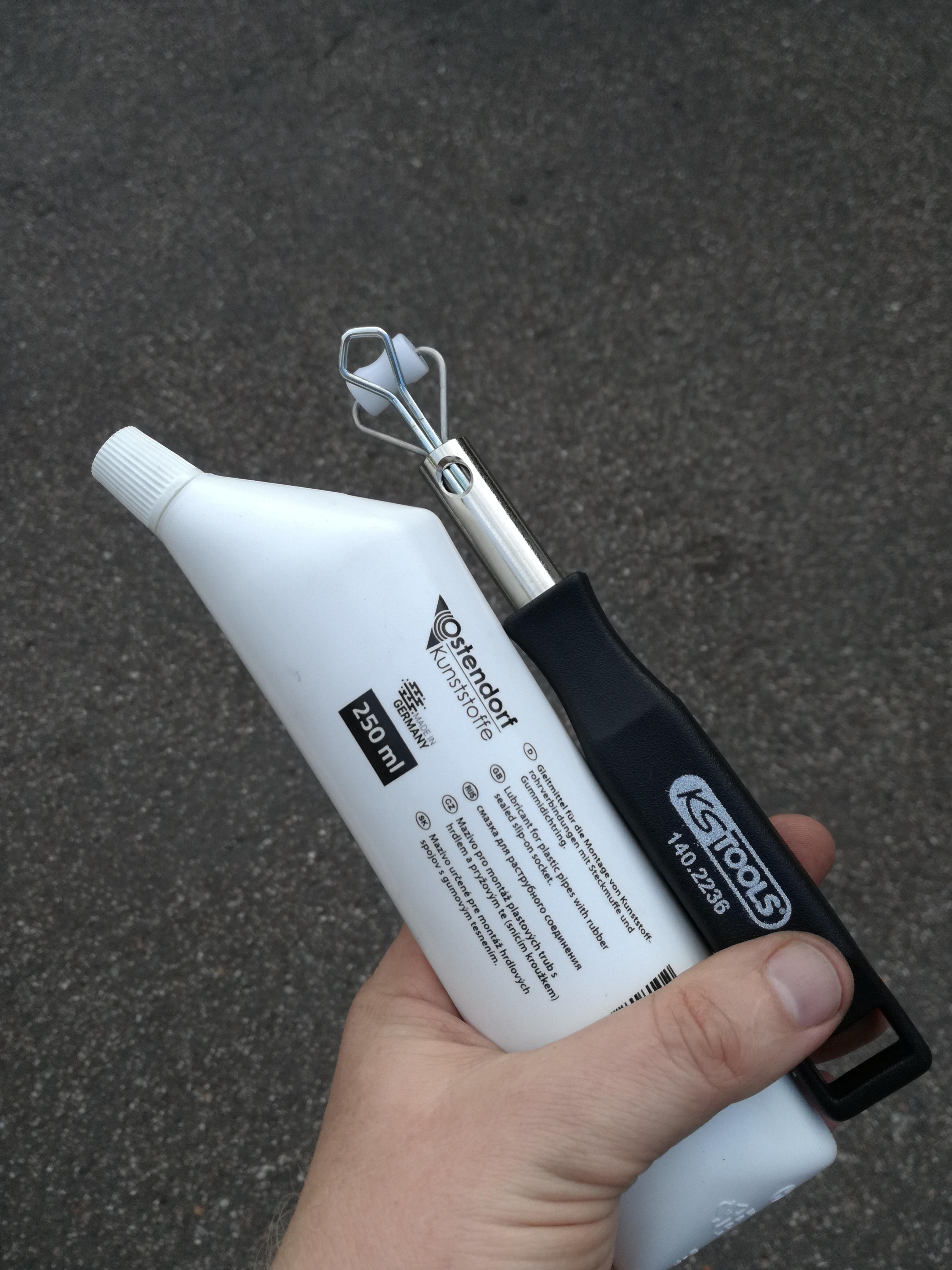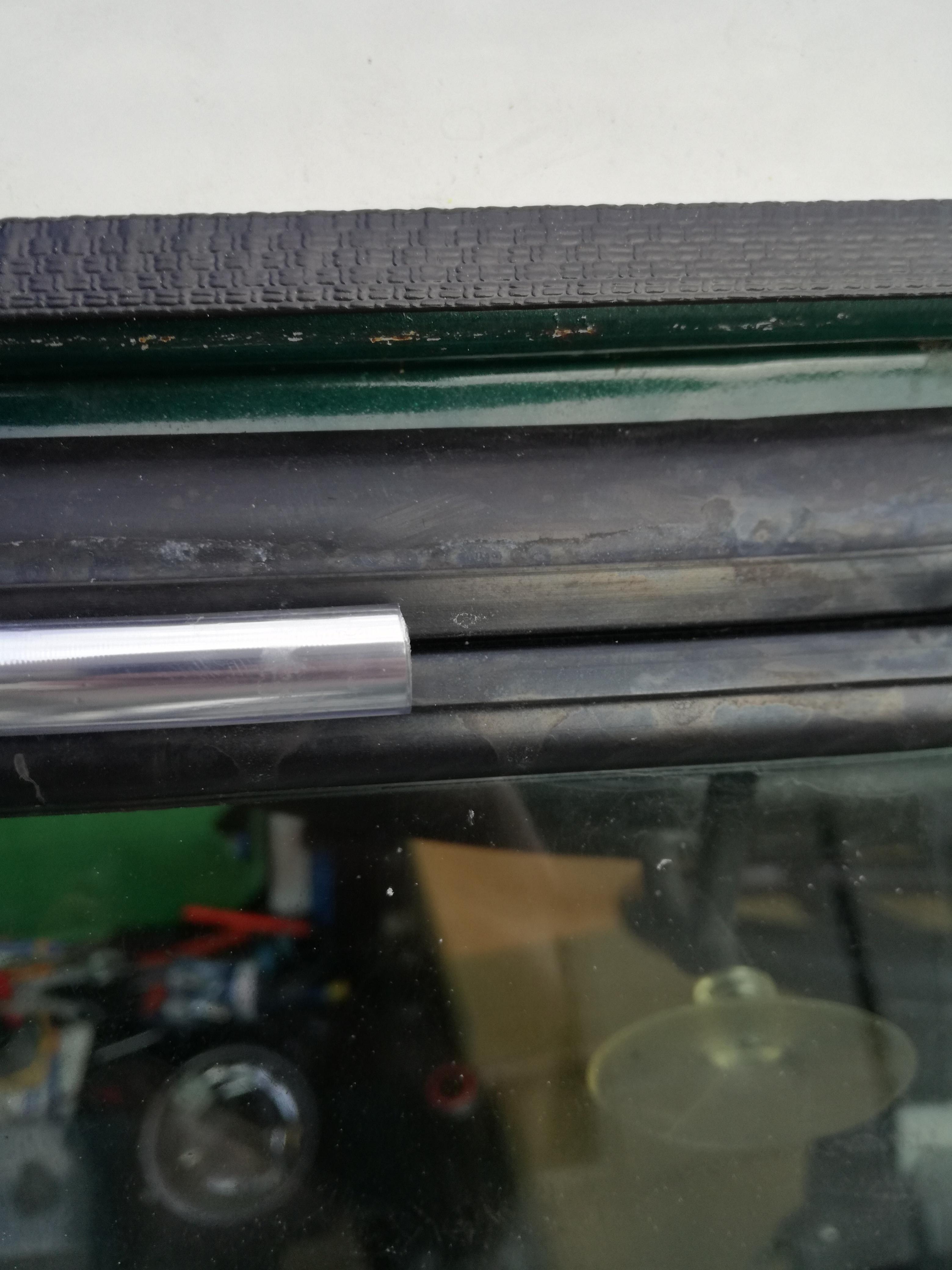 Und so sah die Sauerei aus. Mit einem stumpfen Schraubenzieher habe ich immer 20cm lang die Dichtung aufgedrückt und dann das Gleitmittel reingepresst. Anschließend mit dem Schraubenzieher noch etwas verteilt. Ganz wichtig: den Keder selbst von allen Seiten einschmieren. Und dann mit dem Kedereinziehwerkzeug gegen den Keder kämpfen. Hab das Miststück irgendwann Corona getauft.