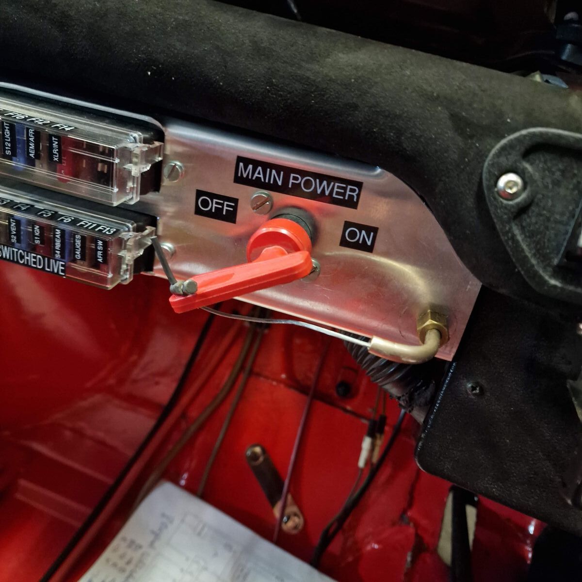 Ich habe einen Notaus direkt an der Batterie zwischen dem - Pol und dem Massepunkt, betätigt wird dieser über einen Seilzug aus dem Motorsport, der vorne am Crossmember neben dem Sitz den Griff hat.