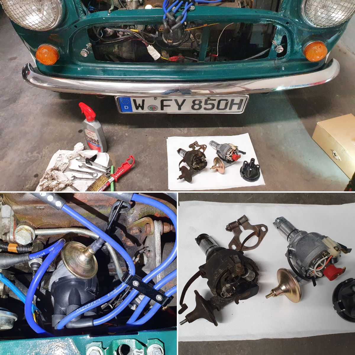 Den Verteiler konnte ich jetzt tauschen, hab den neuen einfach grob so eingebaut wir den alten (dass Verteiler und Kurbelwelle mit der 1/2 Drehzahl zueinander laufen erklärt übrigens auch die falsche Verteilerposition😇)