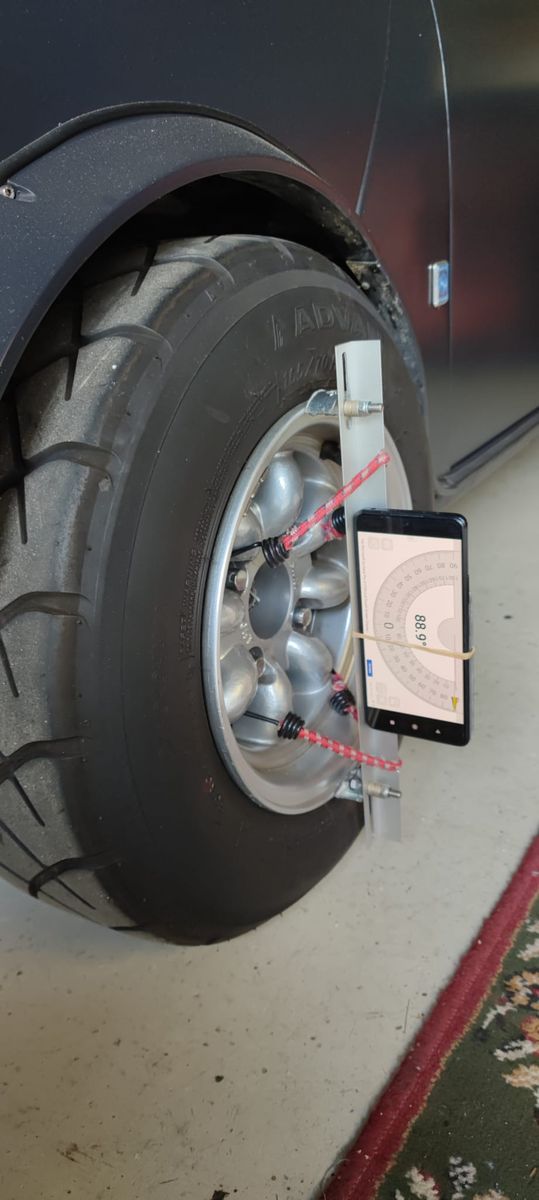 Dann Lenkeinschlag links auf die Markierung und den Sturz messen (digitale Wasserwaage oder wie oben mit der Handy-App...).
