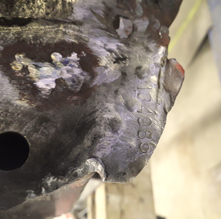 das ist das hintere Ende vom Kotflügel, wo am Übergang zum Boden der kleine Blechstreifen nach unten übersteht (hier rechts): da ist doch glatt eine Zahl eingeschlagen.