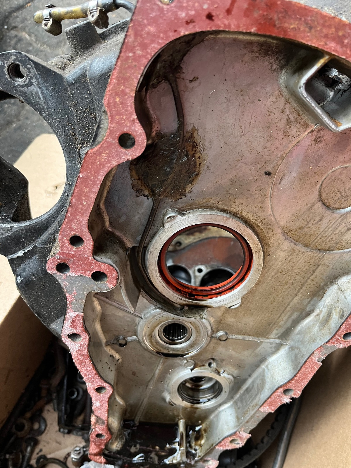 wenn der Kühler raus ist, dann kann ich die Motorlagerung machen, die Tachowelle anschließen und besagte Steuerkettendeckeldichtung erneuern. Denn da ist es mehr als feucht….