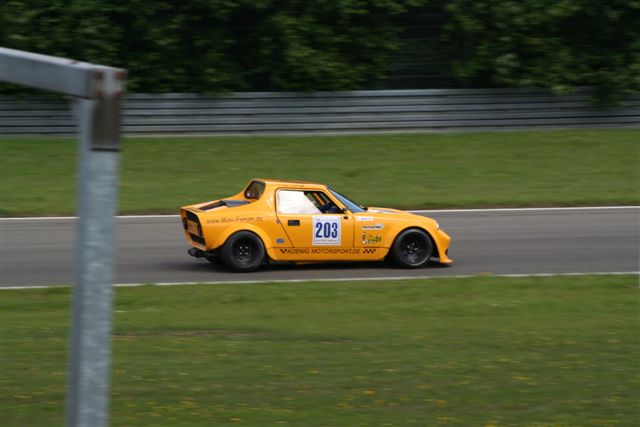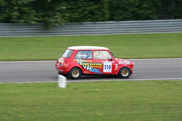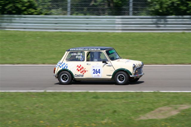Sonntag traten wir bereits kurz nach 11, endlich in strahlendem Sonnenschein, zur von einem Horizont zum anderen reichenden Startaufstellung an. Das Rennen begann dort, wo das erste aufgehört hatte. Teuscher, Binder und ich standen unmittelbar beieinander, schon in der ersten Runde hatte ich alle Hände voll zu tun, Klaus nicht vorbeischlüpfen zu lassen. Fünf oder sechs Runden fuhr ich, Marco im Blick, eine Hand breit vor Klaus durch den Verkehr. Gerade als meine Luft wirklich dünn zu werden schien, entwich sie mir bedauerlicherweise aus dem Reifen, sodass ich den Blinker setzen musste. Zwischendurch hatte Phil aus Frankreich uns alle auf einmal ausgehebelt. An der Reihenfolge (Gr. 1) änderte sich nichts mehr, Dibling vor Marco und Klaus. Ich verbrachte die Zwischenzeit damit, den Streckenposten auf die Nerven zu gehen, weil ich lieber zum Anfeuern an den Streckenrand wollte, als mein Auto abschleppen zu helfen. Insgesamt forderte der Ringgott seinen Tribut, Mano erst ohne dritten Gang und schließlich gar nicht mehr unterwegs, drei abgescherte Radbolzen bei Thomas Alofs und, nicht in der BCT, aber spektakulär, einer explodierten Schwungscheibe in Klaus Klebers Abarth, um einige zu nennen. Wieder sah Faxe die karierte Fahne zuerst, herzlichen Glückwunsch, wurde aber langsam auch mal Zeit…