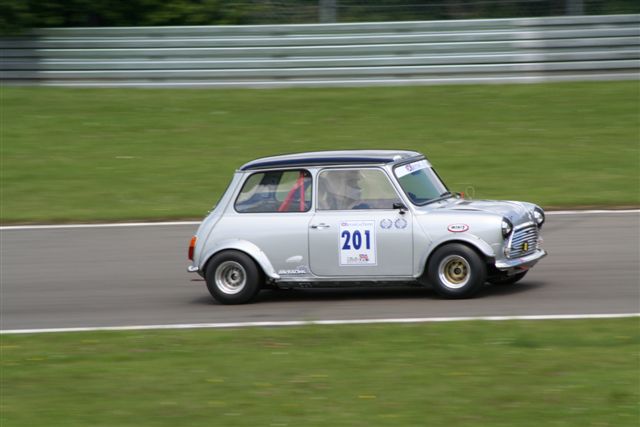 Am Samstag wurde die BCT um halb Acht von der Druckwelle des 46-Liter-Motors des 1908 erbauten „Brutus“ aus den Betten geblasen, den Mitarbeiter des Museums Sinzheim vom Laster luden und bereitete sich anschließend auf den ersten Lauf am Nachmittag vor. Das Rennen war der absolute Wahnsinn, 72 Autos, überall Zuschauer, jede Runde für jeden ein einziges Überholmanöver. Thomas und ich lieferten uns erneut einen heißen Kampf (wir schissen mit Vergnügen darauf, dass wir in unterschiedlichen Klassen gewertet wurden und genossen die Action). Das Video meiner Onboard-Kamera belegt Abstände im Zentimeterbereich und teilweise vier abwechselnde Überholungen pro Runde. Schließlich ließ Thomas mich ziehen, ich überholte (mit einem weinenden Auge) den Binder-Mini, dessen heißer Fahrstil (Tattoo bleibt unerwähnt) in der vorletzten Runde leider zum Dreher führte und passierte am Kotflügel des Kollegen Teuscher klebend die Ziellinie. Klaus Binder wurde Dritter (Gr. 1). Jochen Pelke musste sein Auto leider mit kapitalem Motorschaden auf den Hänger stellen, Sieger insgesamt wurde Faxe, der sich von dem 39. Platz vorarbeiten konnte.