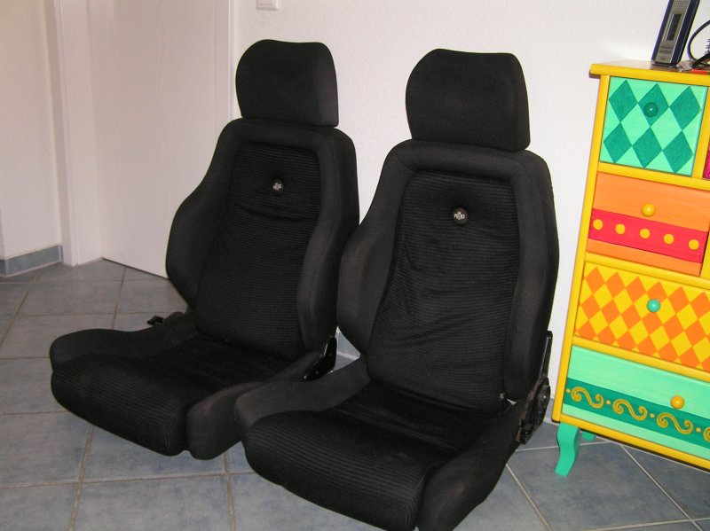 hab hier einen Satz Sportsitze in schwarz. Hersteller ist König, Typ Prinz. Sind vom Format wie die alten Recaros. Gebe einen Satz Laufschienen von Recaro mit dazu (die passen) und Konsolen, die vermutlich aus einem Opel stammen. Die Konsolen sind eine gute Basis zum Anfertigen von Konsolen für den Mini.