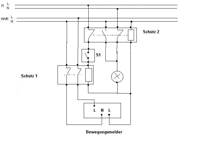 Ist S1 aus und der BM schlägt an, zieht Schütz 2 an und trennt S1 sowie den Nulleiter des Verbrauchers zur FI Leitung und gibt den Nulleiter vom Verbraucher zur "HWR" Leitung frei.