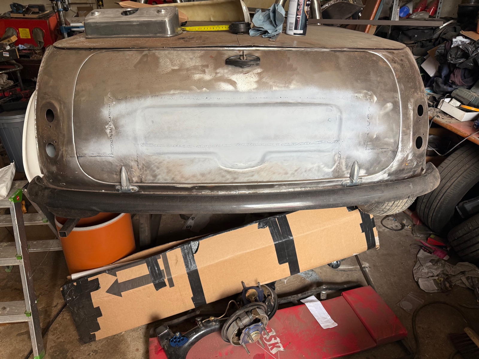 Wenn man unterhalb der „Dose“ mit der Stahlwolle das Rohr aufschneidet und dort einen Schlauchstutzen anschweißt, kannst du dir eine Nachfüll-Leitung bis ins Armaturenbrett fummeln …..