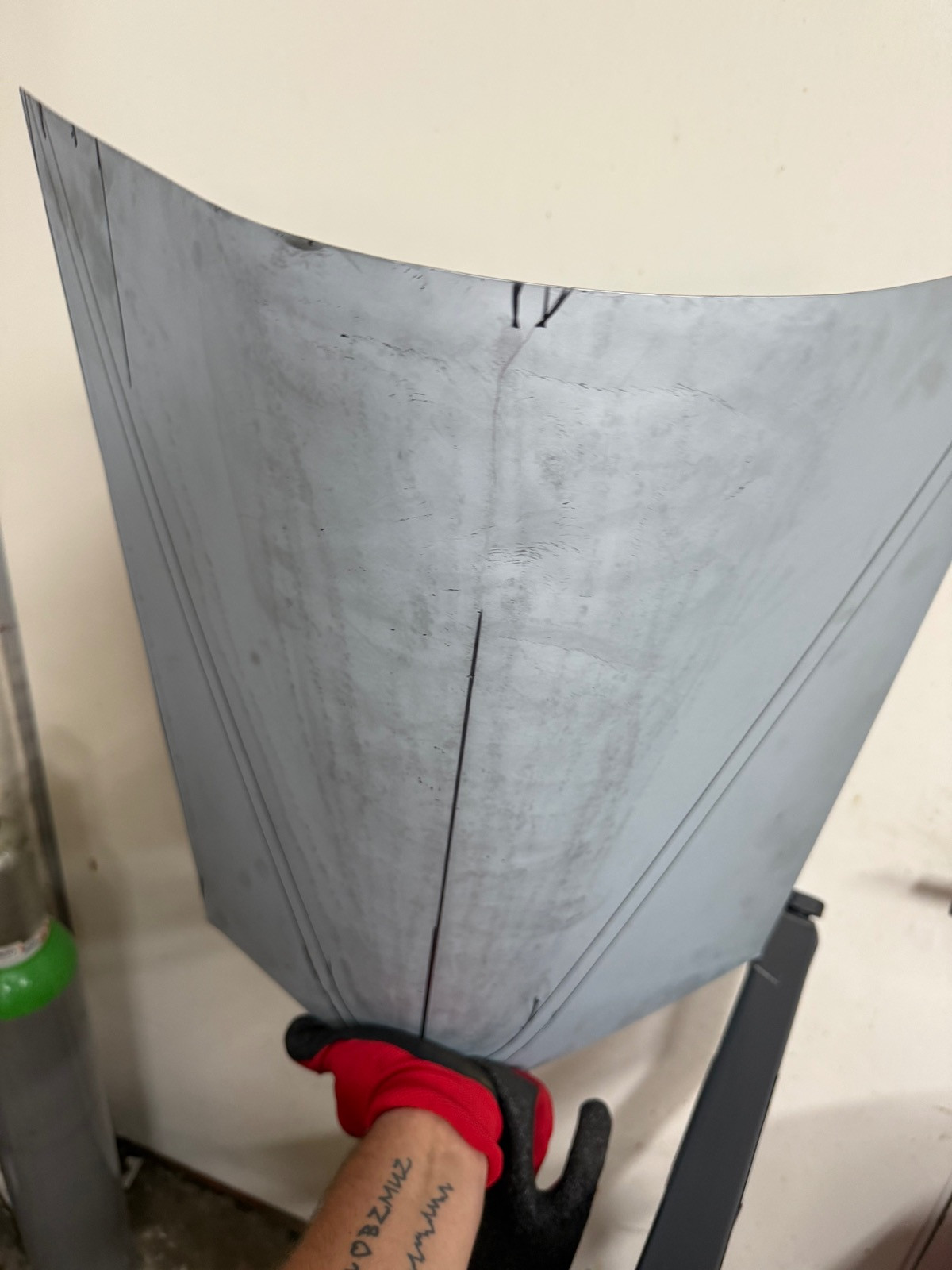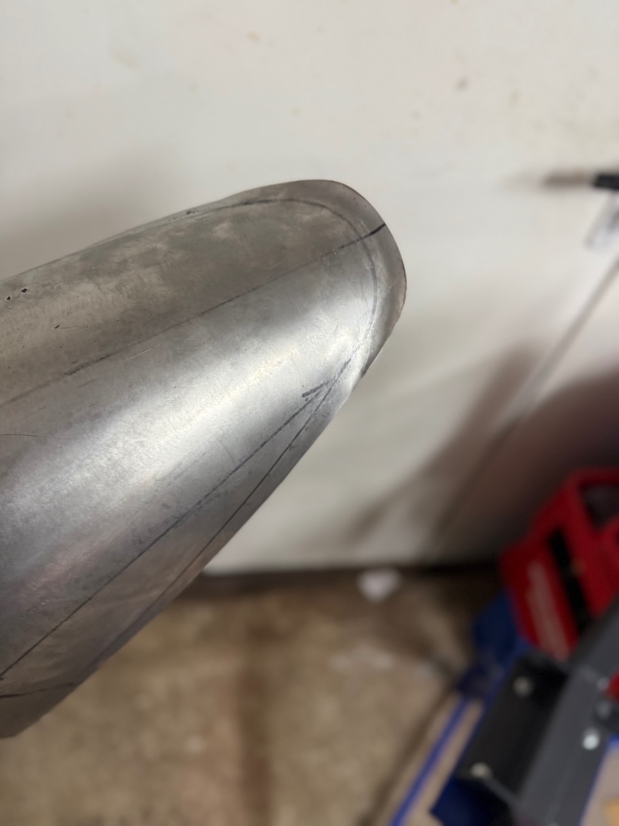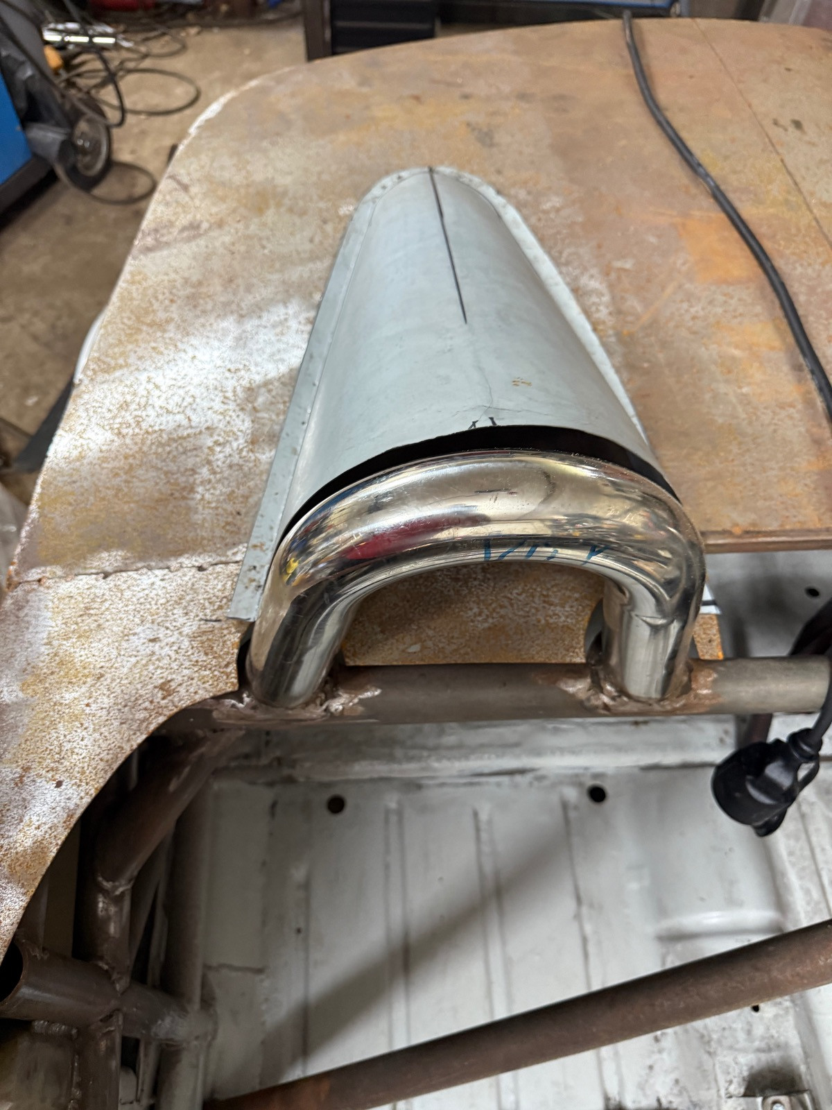 ...mir fehlen leichte Rundungen. Die Grundlinien seitlich und oben nach hinten könnten eine Wölbung nach außen vertragen. Das geht vermutlich nur mit nem "English Wheel" oder viel Zeit und nem Hammer. So sieht es sehr geradlinig aus, das passt nicht so zum knubbeligen Rest.