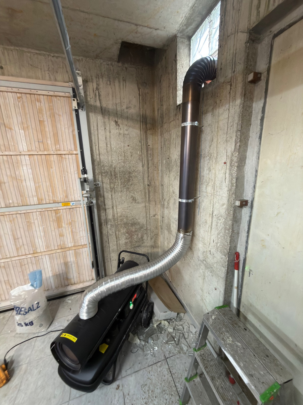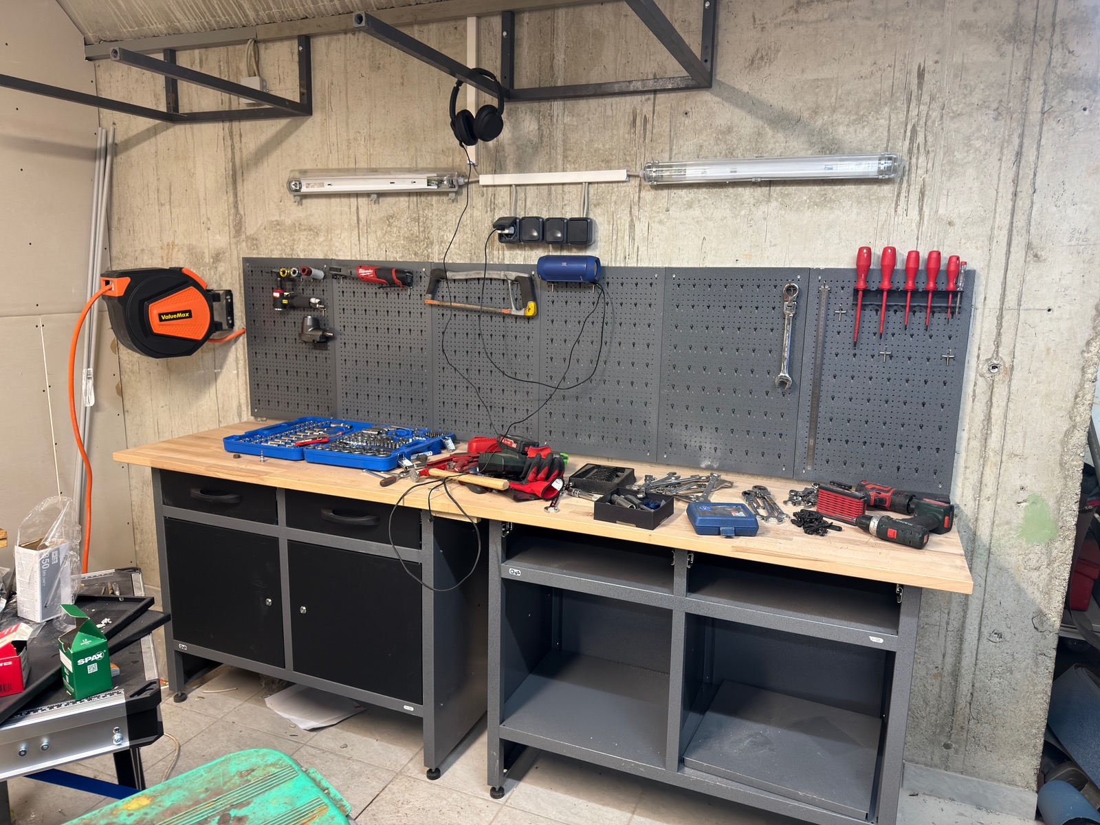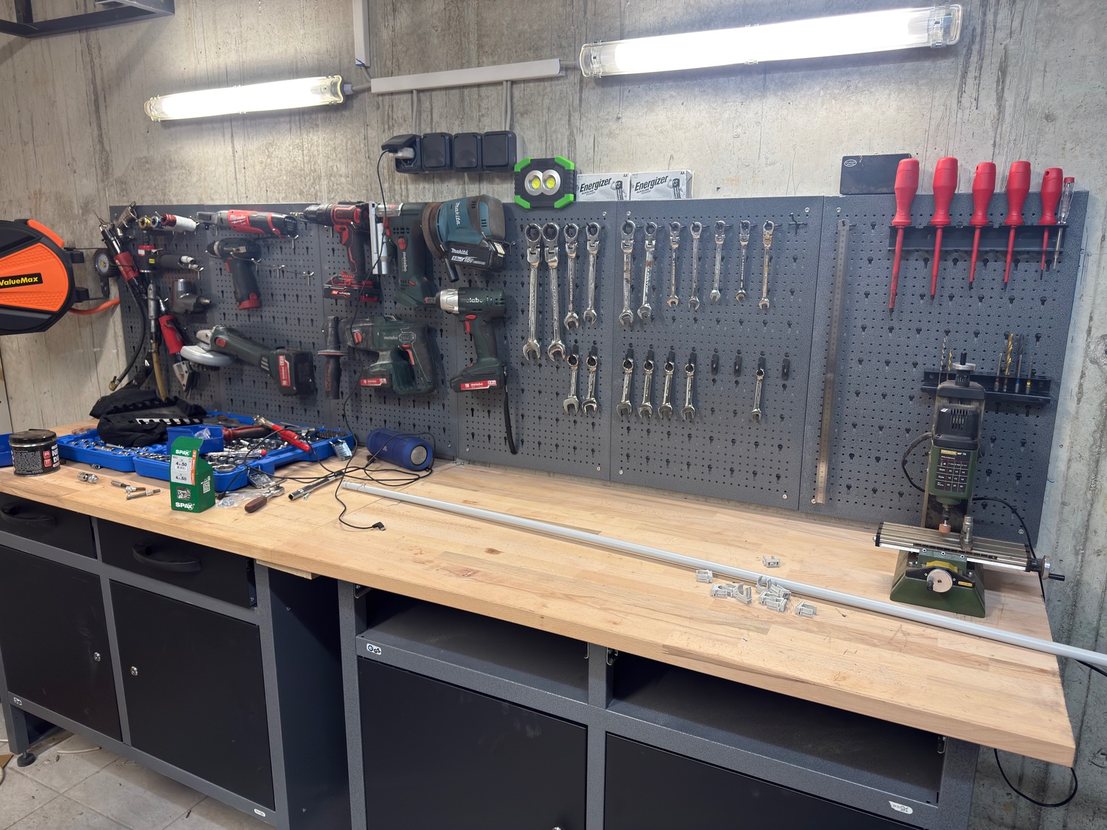 den Strom im Griff gekriegt. War gar nicht so einfach weil keine Sicherung irgendwo zugänglich waren, muss ich halt am offenen Herz operieren. Kamin habe ich rausgelegt jetzt muss ich noch Schellen ran machen, dass mein Alurohr hält. Ansonsten hab ich Haken bestellt und fang morgen mal bisschen an Werkzeug an die Wand zu hängen.