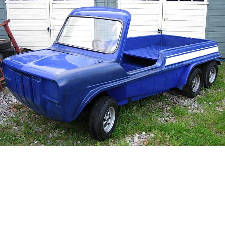 Aufbau ist komplett aus GFK, also sehr sehr leicht. Ist top gemacht, zB ist das Armaturenbrett mit Lederstruktur laminiert. Die Ladefläche kann man teilen und als Rücksitzbank umfunktionieren.