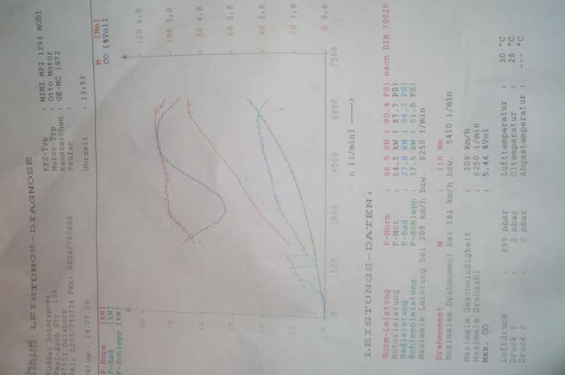 Am Ende standen 90,4 PS und 110Nm auf dem Diagramm. Ab 2750 U/min liegen 100Nm in einer leicht aufsteigenden Kurve an, die ihren Topwert 110Nm bei 5400 U/min erreicht.