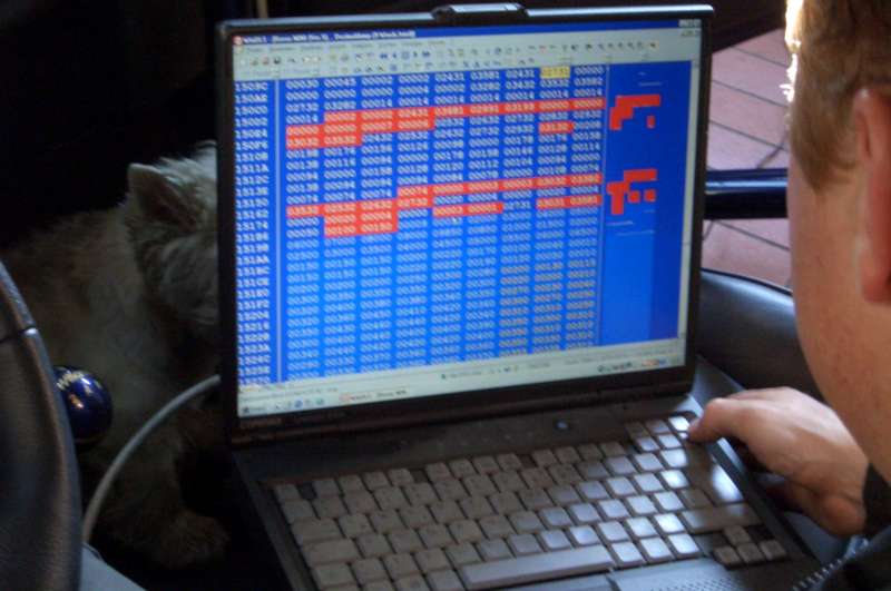 Dann Steuergerät ausgebaut, aufgemacht, Sockel eingelötet, E-Prom eingesetzt, frischen Datenstand drauf, neue Messung, nochmal längere Einspritzdauer obenraus nachprogrammiert, und...... alles prima.