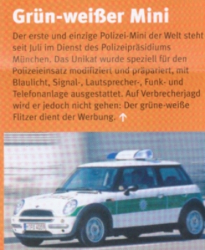 um es deutlich zu sagen, dieser New Mini ist als regulärer Streifenwagen der Münchner Polizei (BAYERN) im EINSATZ. Nichts mit "Werbezweck...und es ist auch kein "FAKE" Bild....