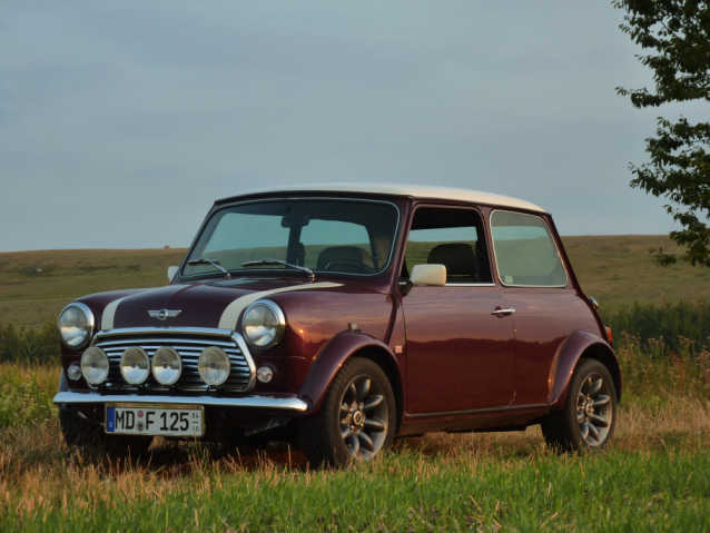 -Lackiert in "Clove brown" mit Dach, Spiegel und Rennstreifen in "Old English White". Darüber Klarlack mit Perleffekt