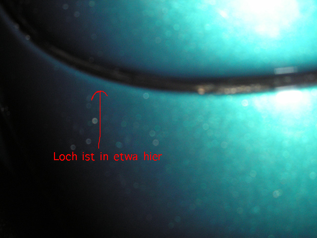 • Das Foto habe ich gemacht. Das Loch erkennt man leider nicht, ist selbst bei Tageslicht sehr schwer zu erkennen. Hab das auch erst jetzt gemerkt, da ich den Schlauch unter dem Blech entfernt habe und somit etwas Licht durchscheinen konnte.