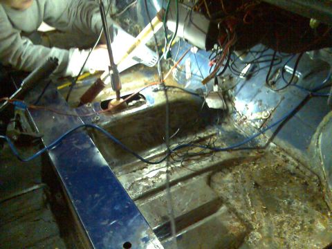 • 1. Den Innenraum befreien wir gerade vom UBS, danach blank schleifen, füllern, lackieren. Macht es Sinn, das Bodenblech in Wagenfarbe (das blau-metallic) zu lacken oder eher was einfaches, widerstandsfähiges?