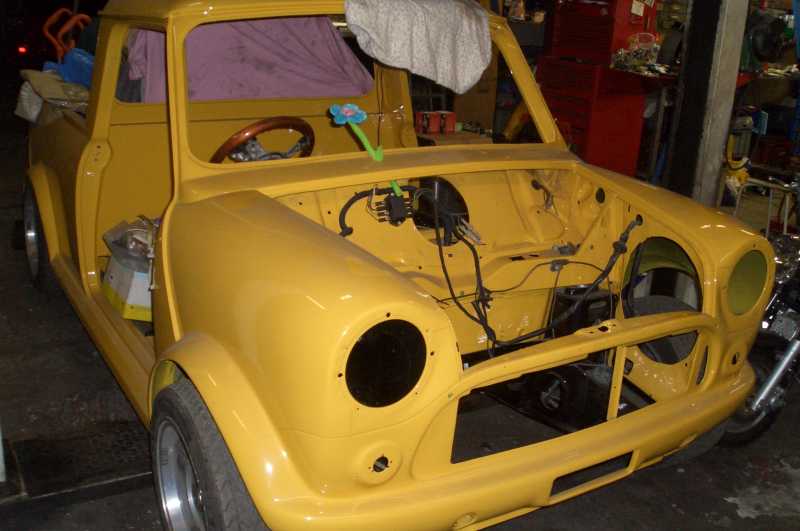 Bei meinem gelben Pick-up war die Fahrergröße beim Neuaufbau bedacht worden. Schließlich ist der Vorbesitzer 190cm groß. Die Rückwand des Häuschens ist geändert und es sind VW-Porsche Sitze vorgesehen.