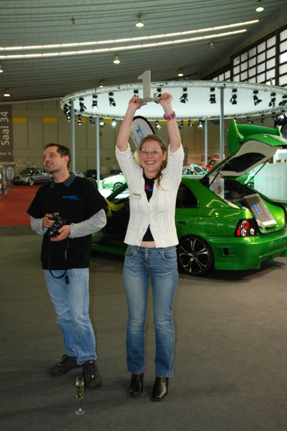 Siegerin ist Doris Zanotti aus Salzburg / Österreich mit einem absoluten Eyecatcher: Einem original Austin Mini aus dem Jahr 1972. Doris ist die Herausgeberin der "Schrauberzeitschrift im Netz" http://www.supper-mini.de. Sie war mit Ihrem Verlobten Norbert Supper vor Ort, das Paar besitzt ganze 7 eigengetunte Minis (alte Serie) aus den Jahren 1966 bis 1999! Teilgenommen haben sie mit einem Fahrzeug, das noch mit seinem originalen Lack ("diamont white") versehen und zusätzlich mit etlichen pinkfarbenen Elementen ausgestattet war (Motor, Car-Hifi-Komponenten, Dach sowie pink-lederne Innenverkleidung). Die gesamte Innenausstattung stammt aus England, wo das Paar 2009 auch einem Treffen anlässlich des 50. Geburtstag von Mini in Birmingham vor Ort war.