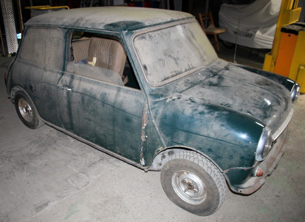 wie schon vor Längerem angekündigt trenne ich mich jetzt auch vom zweiten Mini-Wrack, das ich damals beim Aufkaufen einer Hobbyauflösung mit dazu nehmen musste. Es handelt sich um einen 1000er von 1975 in dunkelgrün / innen beige. Er ist an praktisch allen Stellen durchgerostet wo ein Mini nur rosten kann - also überall.... Der Motor lässt sich von Hand durchdrehen und lief bis zur Stillegung angeblich einwandfrei, Gänge lassen sich einlegen. Der Mini wurde 1998 stillgelegt und verbrachte die letzten 13 Jahre unter einem Carport, er trägt noch den Schmutz dieser Jahre.