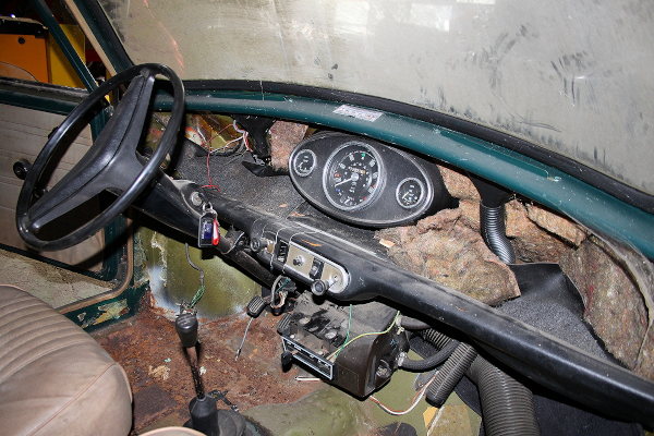 Ansonsten ist der Mini bis auf ein paar Kleinteile weitgehend komplett, es gibt auch etliche brauchbare Teile wie Tacho-Ei mit Instrumenten, Originallenkrad, Teile der Innenausstattung, alle Scheiben, Scheinwerfer, Rückleuchten usw.. Auch Schlüssel für Zündschloss und Türen sind vorhanden. Die Summe der Teile übersteigt deutlich den geforderten Preis, insbesondere mit der kompletten '75er Fahrzeughistorie.