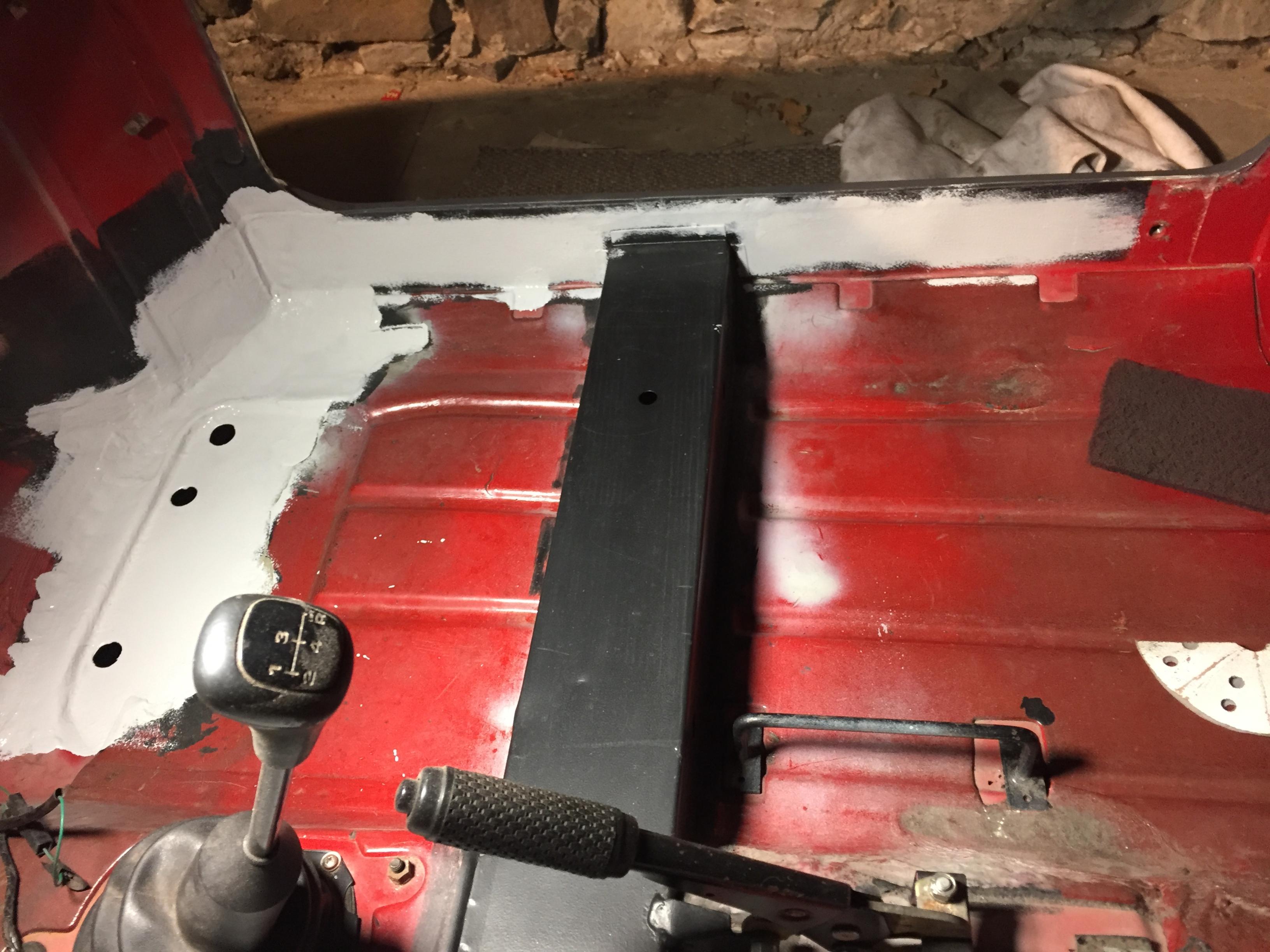 ich habe gestern abend die eingeschweißten Bleche penibelst mit der Zopfbürste und mit Schleifpapier bearbeitet. Danach mit Silikonentferner gereinigt und mit Genius Pro Rostschutzgrundierung (Acrylgrundierung auf Wasserbasis) grundiert.