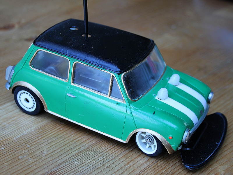 Das Modell hat einen ungefähren Maßstab von 1:20, ist ohne den vorderen Bumper (wichtiges Teil!!!) ca. 16 cm lang. Meines Erachtens wurde hier vor langer Zeit eine alte Standmodell-Bausatz-Karosserie (Imai Inno Cooper 1300, 80er Jahre) auf ein passendes, ziemlich leistungsstarkes Fahrwerk montiert. Einige kleine Anbauteile des Bausatzes (Scheibenwischer, Rückspiegel etc.) fehlen, was aber den Gesamteindruck nicht stört. Würden eh ständig abfallen, da das Modell permanent irgendwo aneckt. Es ist wirklich SAUSCHNELL!