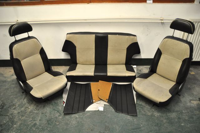 Vordere Sitze und hintere Sitzbank komplett mit Seitenverkleidungen. Die vorderen Türpappen grundsätzlich auch, dann aber nach Möglichkeit im Tausch gegen andere...